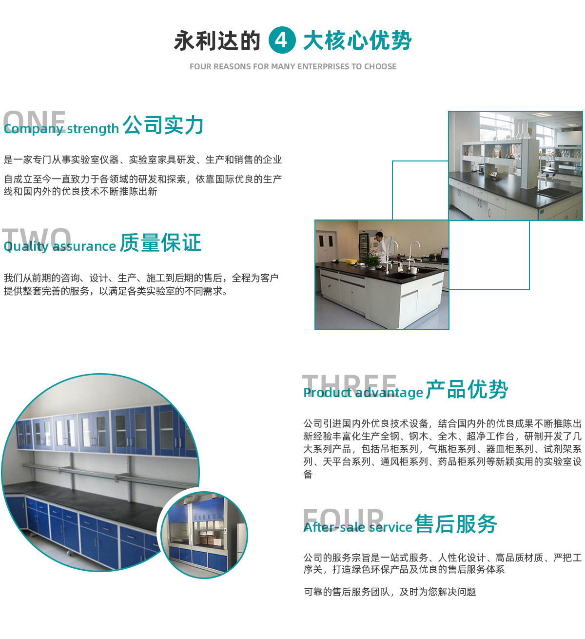 天津永利達(dá)實(shí)驗(yàn)室設(shè)備有限公司是一家從事實(shí)驗(yàn)室家具研發(fā)、生 產(chǎn)、銷售與服務(wù)于一體的企業(yè)。成立于2006年,坐落于天津市靜海高新產(chǎn)業(yè)園區(qū)。公司秉承“科技創(chuàng)新、質(zhì)量為本、服務(wù)至上”的理念,致力于為用戶提供實(shí)驗(yàn)室家具和整體解決方案。 公司的主要業(yè)務(wù)涵蓋了實(shí)驗(yàn)室家具、實(shí)驗(yàn)室通風(fēng)、凈化、集中供氣、純水及裝修等多個(gè)領(lǐng)域,憑借多年在實(shí)驗(yàn)室行業(yè)的積累,和不斷吸收國際上的技術(shù)與設(shè)計(jì)理念,我們從前期的咨詢、設(shè)計(jì)、生產(chǎn)、施工到后期的售后,全程為客戶提供整套完善的服務(wù),以滿足各類實(shí)驗(yàn)室的不同需求。 公司的服務(wù)宗旨是 提供人性化設(shè)計(jì)、材質(zhì)、嚴(yán)把工序關(guān),打造綠色環(huán)保產(chǎn)品及完善的售后服務(wù)體系。